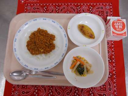 今日は、今が旬のさつまいもをたっぷり使ったスイートポテトを作りました。丸ごと、じっくり時間をかけて蒸したさつまいもをマッシュし、砂糖・バター・生クリームを加えて成形し、照りだし用の卵を塗って焼くデザートです。実はこのメニューは根強い人気があり、リクエスト献立でもデザート部門で上位に入ります。どのクラスもおかわり希望の手がたくさん挙がり、空っぽのバットが返ってきました。3年生からは『すごくおいしかったです!』との感想がありました。