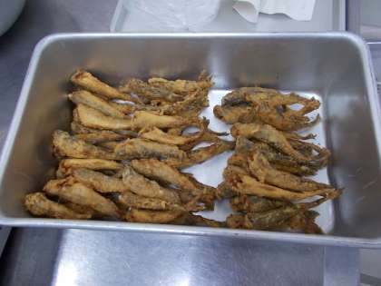 今日、から揚げにした小魚は北海道産の「氷下魚(こまい)」です。「氷」の字が使われているように、今の寒い季節が旬の魚です。小ぶりでも骨が硬い魚なので、じっくり時間をかけて揚げてまるごと食べられるようにしました。骨を残した生徒は比較的少なかったようです。