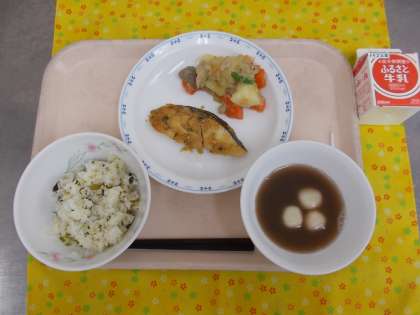 ・青菜とじゃこのごはん ・牛乳 ・さわらのからしみそ焼き