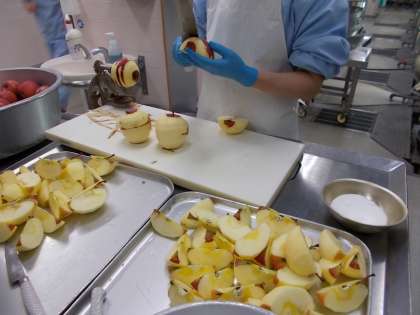組み合わせた果物はりんごです。皮むき器で皮をむき、芯と残った皮をとって1/6にカットしていきます。