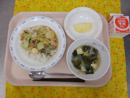 中華丼は、給食の数ある料理の中でもいちばんといっていいくらい多くの食材が入る料理です。肉・うずら卵・魚介・野菜がたっぷり、寒い時期には片栗粉のとろみで冷めにくいので体をあたためるのにもおすすめです。