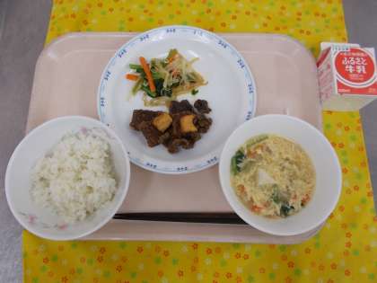 日本では、沿岸部でくじらを常食してきており、戦後しばらくは貴重なたんぱく源として給食にも頻繁に登場していました。しかし商業捕鯨禁止により、くじらが給食に出る機会は激減しました。今日のくじらは、北西太平洋での調査捕鯨でとれたニタリクジラです。下味をつけ、粉をはたいて油で揚げて素揚げしたじゃがいもと合わせています。全体的にはよく食べてくれましたが、好みがわかれる食材です。