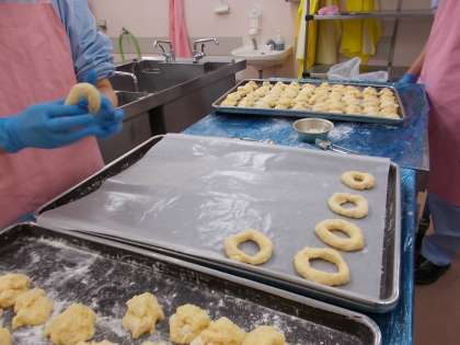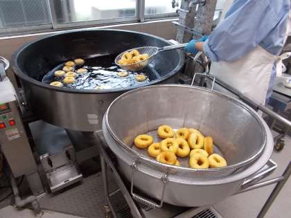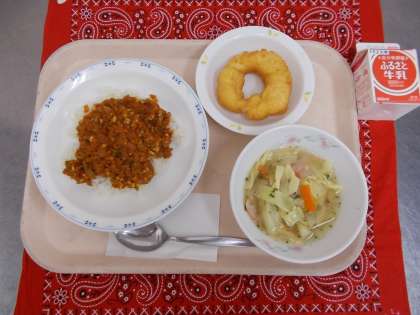 給食室で小麦粉と卵、砂糖、牛乳をメインに生地を作り、穴をあけて形作り、油で揚げて作りました。トッピングシュガーなどもなく、シンプルなドーナツです。お休みが多いクラスもあったので、おかわりが希望者にいきわたったようです。