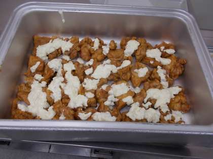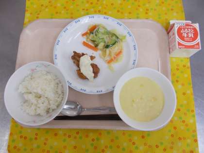 今日は3年A組のリクエスト献立でした。チキン南蛮は、片栗粉をつけて揚げた鶏肉を甘酢にくぐらせ、タルタルソースをかけてあります。コーンポタージュにはレンズ豆を加えて鉄分を強化し、米粉でとろみをつけました。コーンの黄色が生きた良い仕上がりでしたが、やや残りがありました。