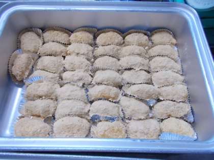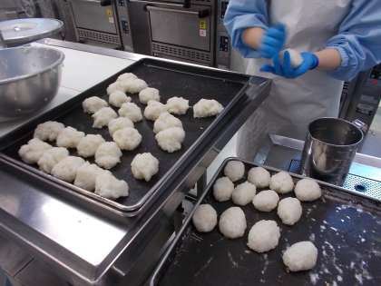 昨日は春分の日、彼岸の中日でした。そこで今日は、給食室でぼたもちを作りました。米・もち米・麦を合わせて炊き、1人分ずつに分けて成型し、きなこと砂糖を合わせたものをまぶしていきます。うどんと組み合わせることが多いのですが、今日はどのクラスもよく食べてくれていました。