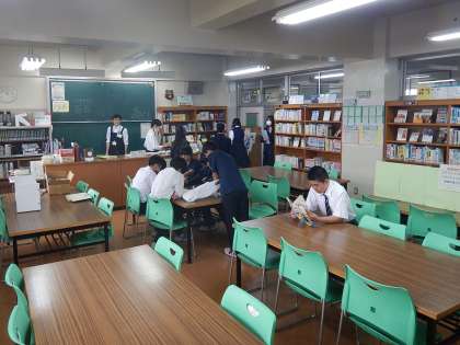 図書室の様子です。本を読む人や教科の課題に取り組む人、貸出・返却に訪れる人などそれぞれが静かに過ごしています。
