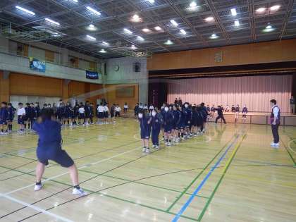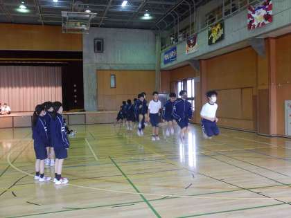 雨のため、体育館で時間を分けて大繩跳びの練習をしました。
