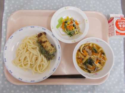 主食は、わかめ・にんじん・ねぎ・油揚げなど9種類の具材がはいった具だくさんなうどんでした。