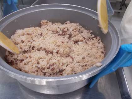 給食室ではお祝いにお赤飯を炊きました。ささげと煮汁を一緒に炊くことで色鮮やかなお赤飯が出来上がります。すまし汁には『祝』とかかれた 祝いなると もいれ、78回目の開校記念日をお祝いしました。