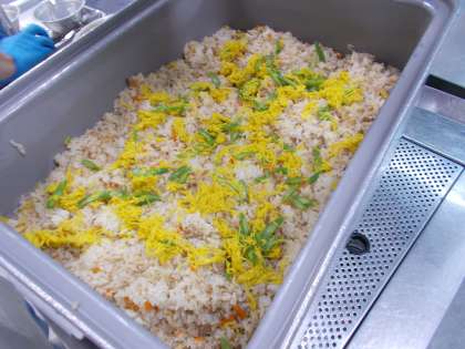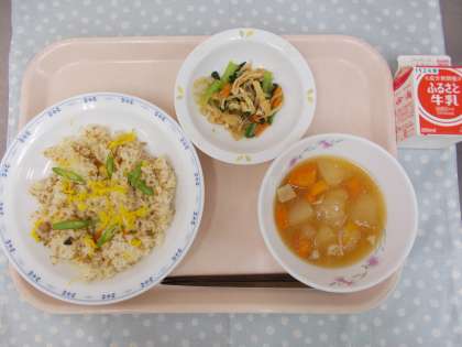 今日は重陽の節句です。重陽の節句は五節句の最後を締めくくる行事で、菊を用いて不老長寿を願うことから、別名「菊の節句」とも呼ばれます。給食では、五目ずしの上に食用菊をちらした菊花ずしを作りました。