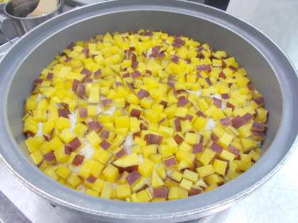 今日は、秋の味覚さつまいもをごはんに炊き込みました。炊き上がるとさつまいもがきれいな黄金色に!崩れないようていねいに混ぜて、黒ごまを散らしました。