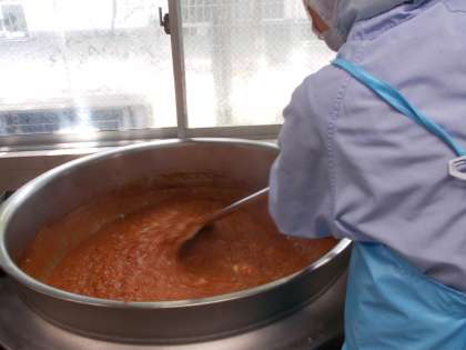 今日の副菜は、大人気のじゃがいものハニーサラダです。細切りにしたじゃがいもを油で揚げ、サラダと一緒に食べます。サラダははちみつ入りの甘いドレッシングで味付けしています。ボリュームのあるサラダですが、どの学級も残さず食べてくれました。