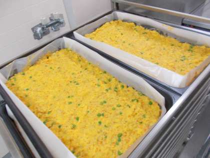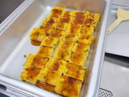 給食の卵焼きは、一度たまごを釜で炒め半熟にしてから鉄板にうつし、オーブンで焼いています。