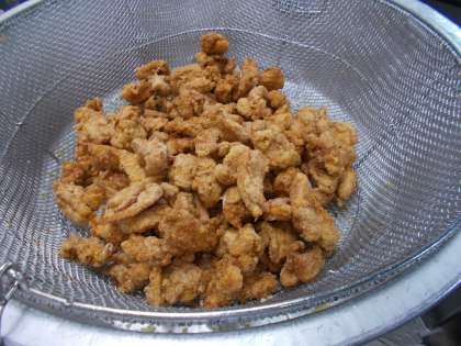 鶏肉のから揚げは、どの学級のリクエストにも入っていた人気メニューです。サラダは油で揚げたしゅうまいの皮が入ったサラダで、よく食べてくれました。