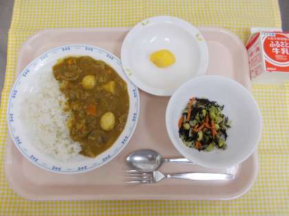 くだものは今が旬の柿です。「柿が赤くなると医者が青くなる」という言葉があります。柿を収穫の季節に食べると病気にならず、医者がいらなくなるという意味です。