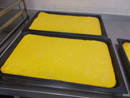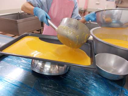 今日は、チキンライスに薄焼き卵をのせた『セルフオムライス』です。卵液を作り、天板に薄く流してオーブンで焼いた後カットしています。天板1枚で12人分、全部で47枚の薄焼き卵を焼きました。