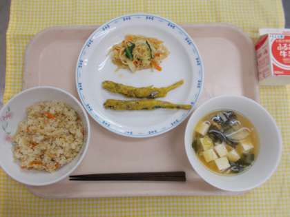・牛乳 ・こぎつねごはん ・ししゃものカレー揚げ