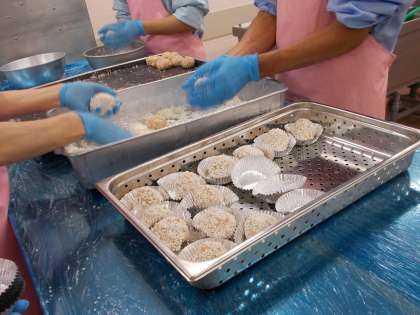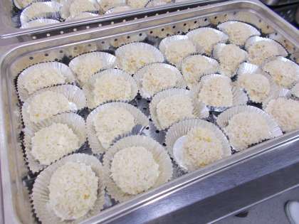 珍珠丸子は、「肉団子のもち米蒸し」です。蒸しあがったもち米が真珠のようであることから、この字があてられています。給食ではあまりたくさんのお肉を使えないので、豆腐やおから、レンズ豆を加えてボリュームアップかつ栄養価もアップした肉団子を作りました。