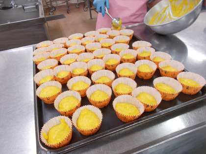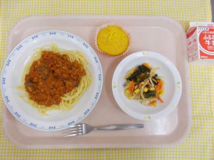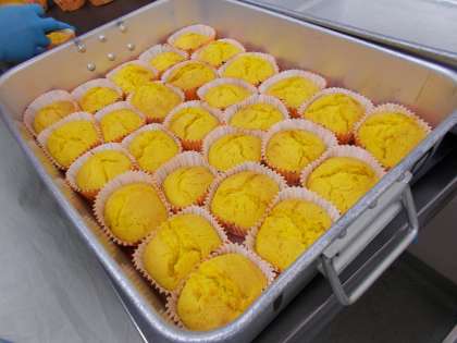 今日のデザートはかぼちゃを使ったマフィンです。かぼちゃはカットし、蒸してからなめらかになるまでつぶします。ペースト状になったかぼちゃを生地に混ぜ オーブンで焼くと、きれいな黄色のマフィンが焼きあがりました。ボリュームはありましたが、どの学級もよく食べくれました。