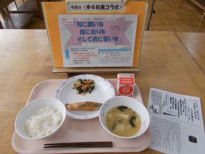 今日は図書コラボ給食です。汐見夏衛さんの「海に願いを 風に祈りを そして君に誓いを」とコラボしました。主人公・凪沙が、恋人・優海のために3時間かけて作った料理を再現しています。給食でも凪沙と同じようにかつおぶしと昆布でだしをとり、ていねいに作りました。