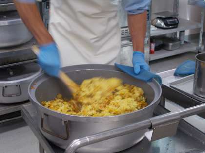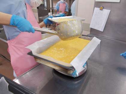 今日の主食はカレー風味のピラフです。ひき肉、にんじん、たまねぎなどの具をカレー粉と塩こしょうで味付けし、ごはんに混ぜ込んで作っています。お米にもカレー粉を混ぜて炊き込んだため、キレイな色に炊きあがりました。