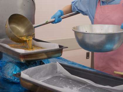 今日の主菜は千草焼きです。「千草」にはたくさん(千種類もの具材が入っているかのよう)という意味があります。今日は鶏ひき肉、ひじき、たけのこ、ほうれんそうなどをたくさん入れました。ゆっくり時間をかけてオーブンで焼いたため、ふっくらジューシーな卵焼きになりました。