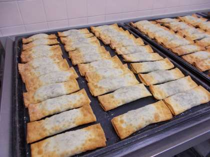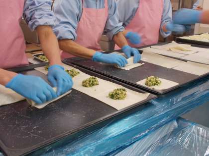 ぎょうざはえび入りで、ふつうのぎょうざよりうまみがぎゅっとつまったぎょうざになりました。給食室では、皮を並べる人、肉だねをのせる人、包む人…と分担しながら一つずつ丁寧にぎょうざを作りました。いつもの給食のぎょうざとひと味違ったぎょうざは評判がよく、どの学級も完食でした!