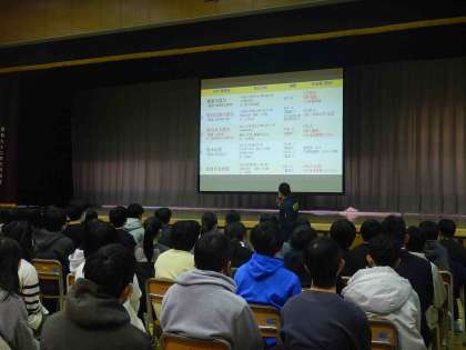 1校時には、全校生徒が体育館で防災講話を聞きました。