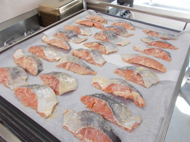 今日の主菜は鮭の塩こうじ焼きです。塩こうじやみそなどで下味をつけた鮭をオーブンで焼きました。調味料に漬け込んで焼くというシンプルな作り方なため、ご家庭でも手軽に作ることができます。
