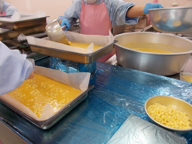 今日の主菜はチーズオムレツです。オムレツの中にはじっくり炒めた玉ねぎとレンズまめ、チーズがはいっています。鉄分とカルシウムがとれるため、成長期の子供たちにおすすめです。具と卵液を合わせてゆっくり焼くと、ふんわり仕上がりました。