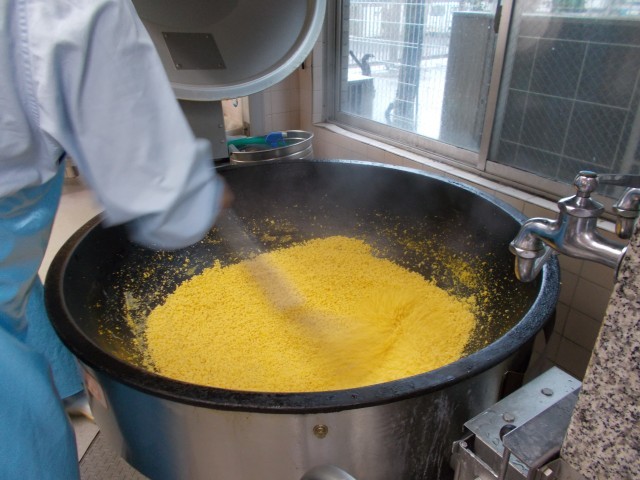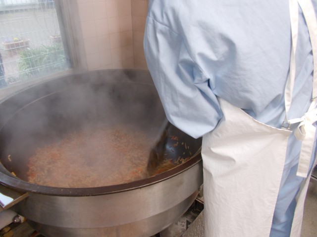 (写真2枚目:かんぴょうなどの具を甘く煮ているところ、写真3枚目:炒り卵を作っているところ)