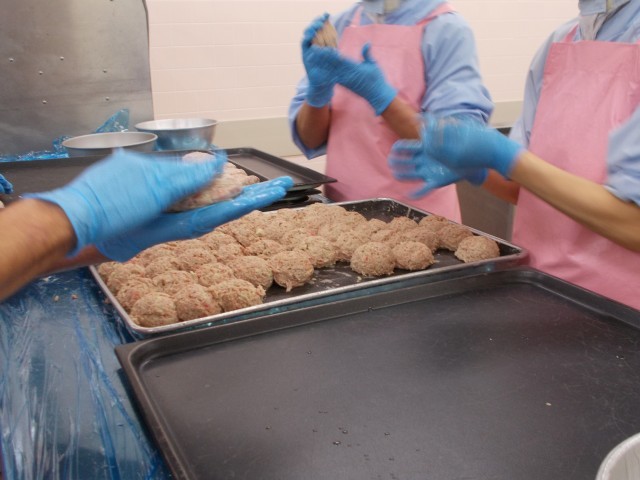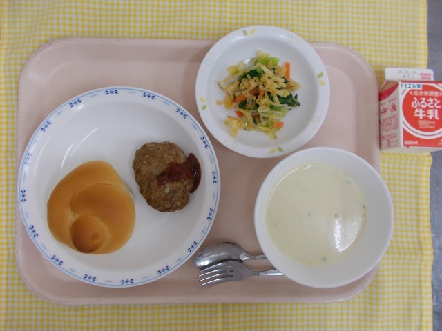 ハンバーグは合いびき肉をよく練って、豆腐やたまねぎと合わせて作ります。キレイに丸めてオーブンで焼くと、給食室中がいいにおいに包まれました。今日はどの学級も食べ残しゼロ!ひとかけらも残さずキレイに食べてくれました。