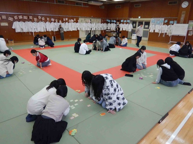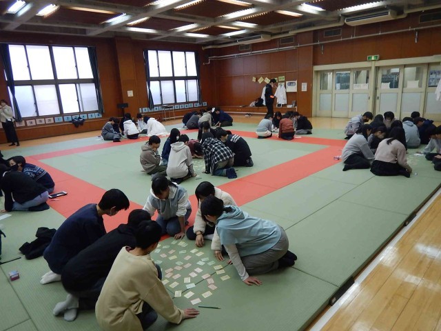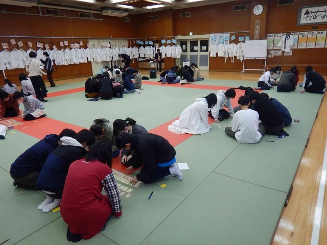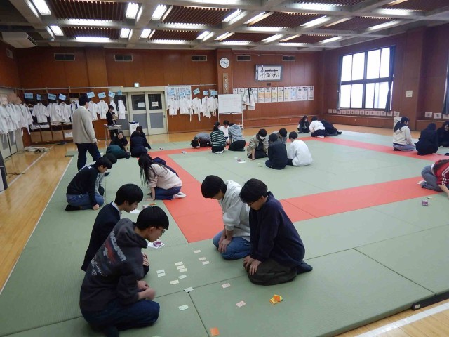 本日8日(土)、1校時には2年生の(1,2枚目)、2校時には3年生の(3,4枚目)百人一首大会が行われました。札に目を向けながら読み手の声に集中して耳を傾ける様子が見られました。