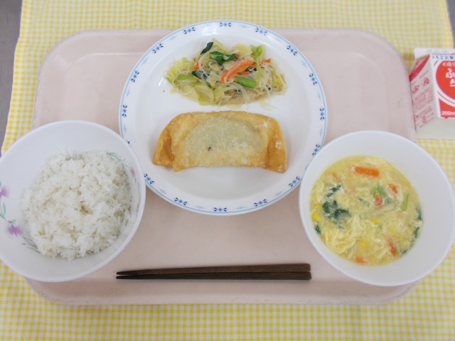 具もたっぷり入って、食べ応え抜群です。しかし、今日のぎょうざはごはんと食べるには少し味付けが薄かったようで、少々ごはんが残ってしまいました。ぎょうざはの方はどの学級も完食でしたが、次やるときは甘酢ダレなどをかけてごはんもしっかり食べられるように調整したいと思います。