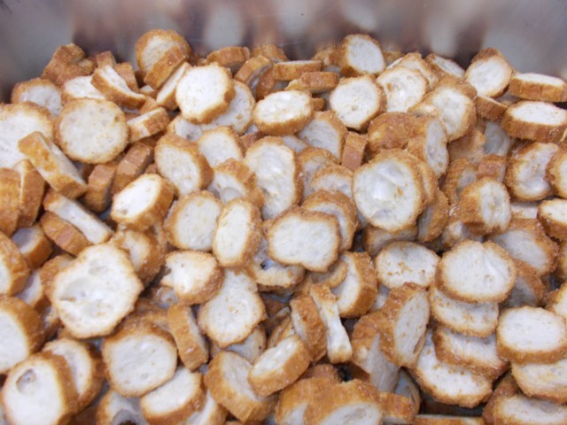 油麩は油で揚げたお麩のことで、フランスパンのような見た目をしています。だしで戻したあと、しょうゆやさとうなどの調味料でじっくり煮て味を含ませました。今日の油麩丼にはお肉を入れませんでしたが、油麩のうまみでコクがありボリュームのある仕上がりになりました。