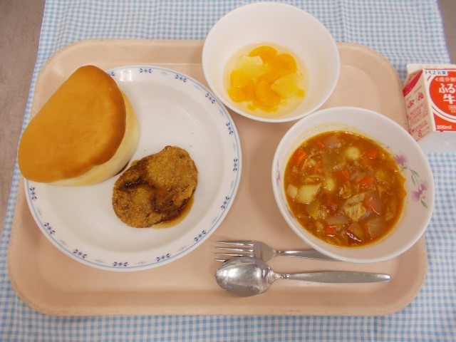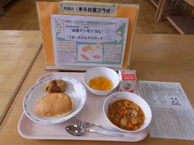 今日は今年度最後の図書コラボ給食でした。奥沢中図書委員の3年生が選んだ2冊、「こまったさんのコロッケ」と「給食アンサンブル」より★印のメニューを作りました。