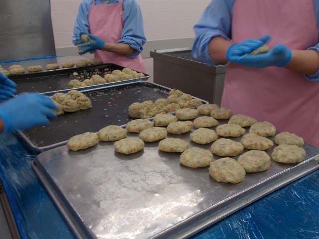 コロッケは、朝早くからじゃがいもを蒸してマッシュし、ひき肉などの具材と合わせてたねを作ります。小判型に成型したら、パン粉をつけて油で揚げます。給食室では約600個のコロッケを作りました。