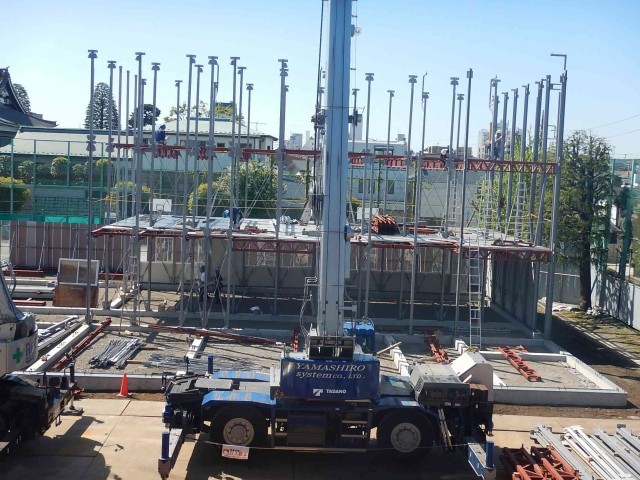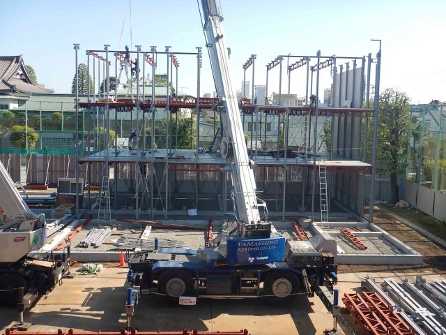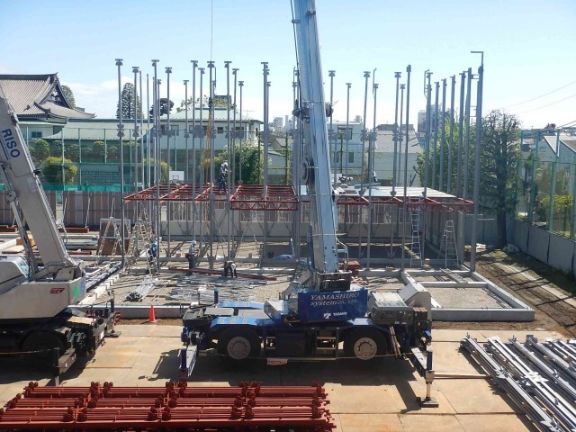 仮設校舎の本体工事が進んでいく様子です。1枚目は15日の昼頃。2階床部分が少し設置され始めました。2、3枚目は16日の午前中。床面に続いて壁面も設置されました。