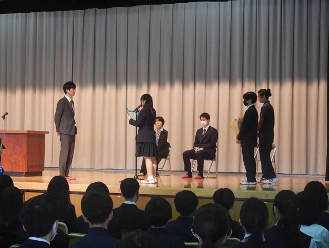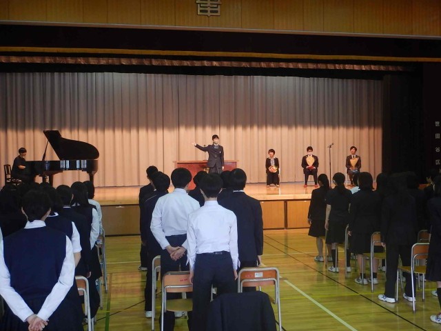 離任式が行われました。生徒からの言葉に続いて、それぞれの先生方からごあいさつをいただきました。最後には、先生方に贈る校歌を歌いました。
