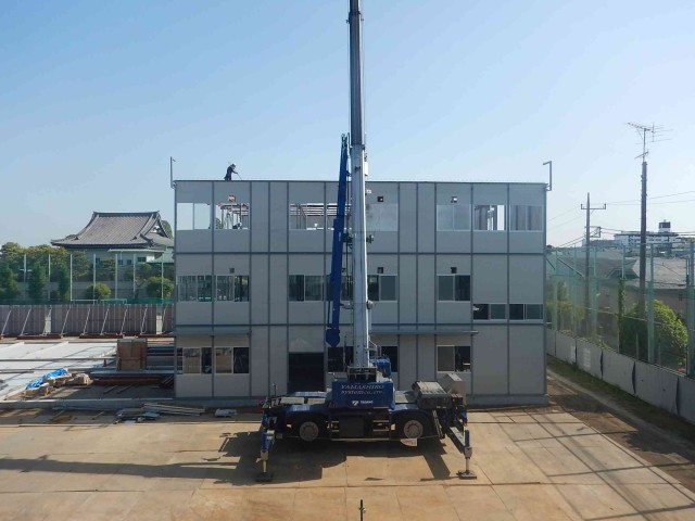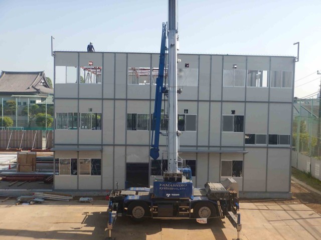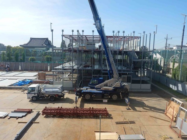 西側校舎の壁面、床面の設置が進んできました。南側・西側に続いて、北側にも壁面が設置され始めました。