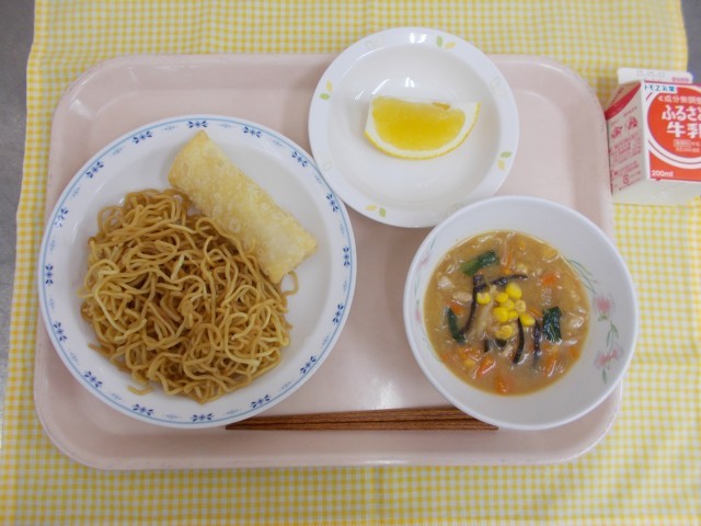 給食のラーメンは、麺とスープを別盛りにしたつけ麺スタイルでいただきます。鶏ガラと豚骨でスープを取り具材を煮ていきます。給食のラーメンスープは、にんじん、たまねぎ、こまつな、きくらげなど10種類の具材が入る具だくさんスープです。トウバンジャンを少し多めに入れて味にパンチをつけることで、塩分控えめでも満足感のある味にしています。