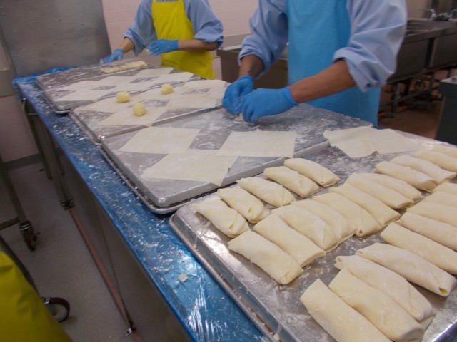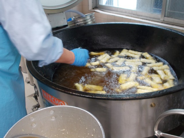 ポテサラ春巻きは、中のポテトサラダから手作りです。33kgのじゃがいもをゆでてマッシュし、卵なしマヨネーズとチーズで味付けして春巻きの皮で包みます。カリッとするまで油で揚げ、完成です。忙しいメニューでしたが、一本一本ていねいに包んで作ってくれました。