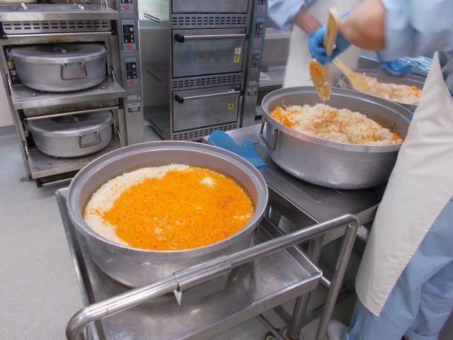クリームライスのごはんはキャロットライスにしました。にんじんを入れることで栄養価もアップし、見た目も鮮やかになります。