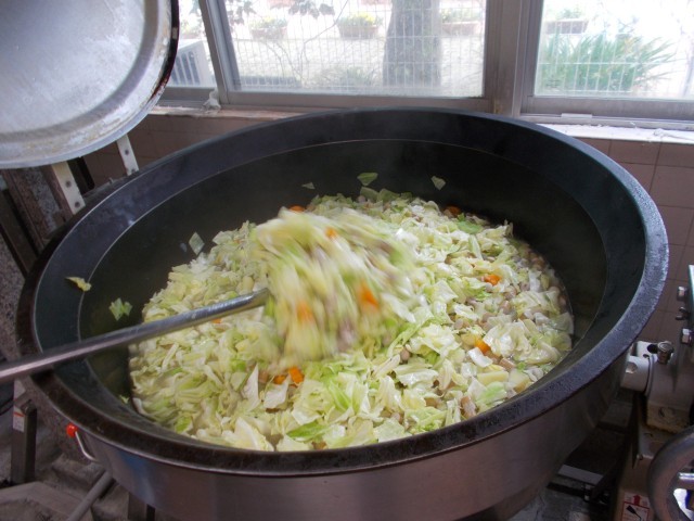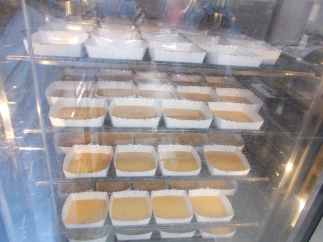 今日の主菜はダイスチーズが入ったチーズオムレツです。チーズの他にも、鉄分アップのためレンズ豆を加えて卵液を作りました。給食室ではスチームコンベクションオーブンというオーブンを使い、蒸気を入れながらオムレツを焼いていきます。蒸気を入れて焼くことで、ふんわりとしたオムレツになります。