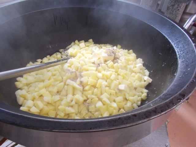 コーンポテトは2校分で50kgのじゃがいもを使いました。ゆでたじゃがいもとコーンにバター、塩こしょうを合わせたシンプルな味付けですが、食べるとバターの香りがふわっと広がる味わいでした。