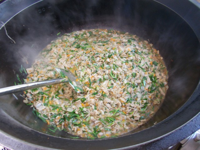 プルコギ丼は、すりおろしたりんごを入れた給食室特製のプルコギだれで味付けしています。洋食などを作るときは野菜をじっくり炒めて作りますが、今日はしゃきっとした食感を残すため、強火でサッと作りました。