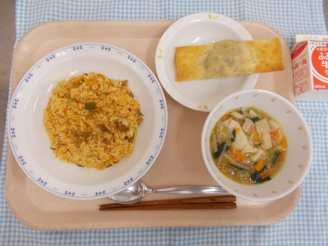 キムチチャーハンは、昨日から楽しみにしている子もいるくらい人気のメニューです。給食ではアレルゲンフリーのキムチを使って作ります。辛いのが苦手な子でも食べられるよう、キムチの汁は調整しながら加えています。体育祭の練習で体を動かしていることもあり、今日もほぼ完食でした。