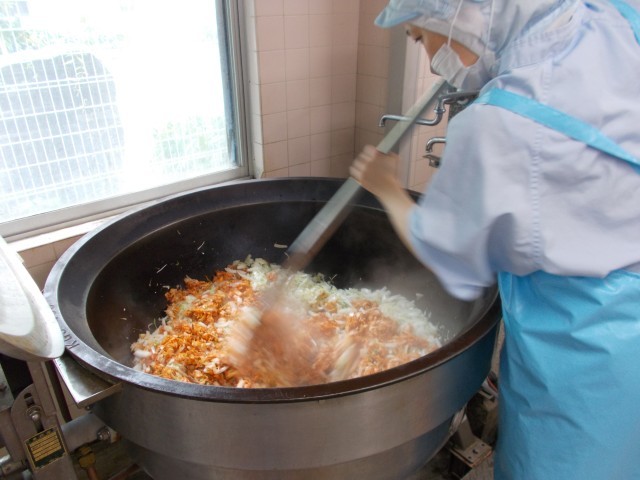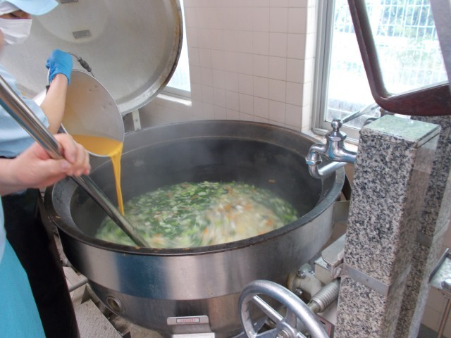 今日は尾山台中学校の給食がなかったため、奥沢中の分のみ給食を作りました。豚キムチは野菜をシャキシャキに仕上げるため、お肉と野菜を分けて炒めています。同じ材料でも、作り方を少し工夫するとおいしさが変わります。えのきと卵のスープは、温度をこまかく調節してから卵を加え、ふわっとした卵に仕上げています。