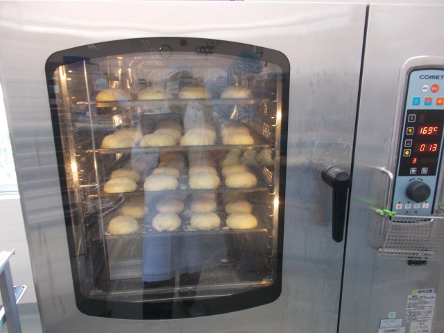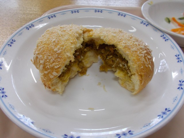 今日は給食室でカレーパンを作りました!生地も具もすべて手作りです。まず生地の材料を4つに分け、それぞれ4人の調理員さんがこねてくれました。時々生地を叩きつけながら、10分以上しっかりこね続けます。一次発酵、二次発酵させたら生地を伸ばし、具を包みます。240個のカレーパンを、ひとつひとつ丁寧に作りました。