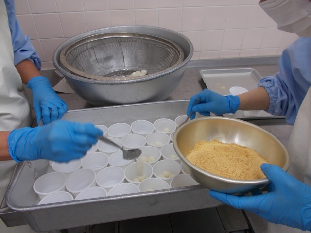 きなこ団子は、白玉をカップに3個ずつ入れ、その上からきなこをまぶしています。